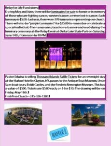 During the rest of June, there will be luminaries for sale to honor or in memory of those who are fighting cancer, survived cancer, or were lost to cancer. Each luminary is $5.00. Last year, there were 370 luminaries representing our church. There will also be “purple Luminaries” for $25.00 to remember or celebrate a special individual. The names are placed on a banner and read during the luminary ceremony at the Relay Event at Delta Lake State Park on Saturday, June 14th, from noon to 10 PM.